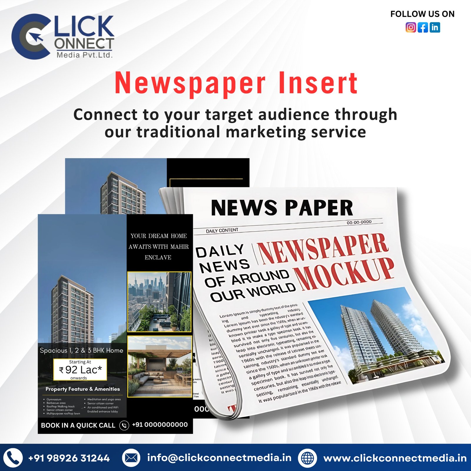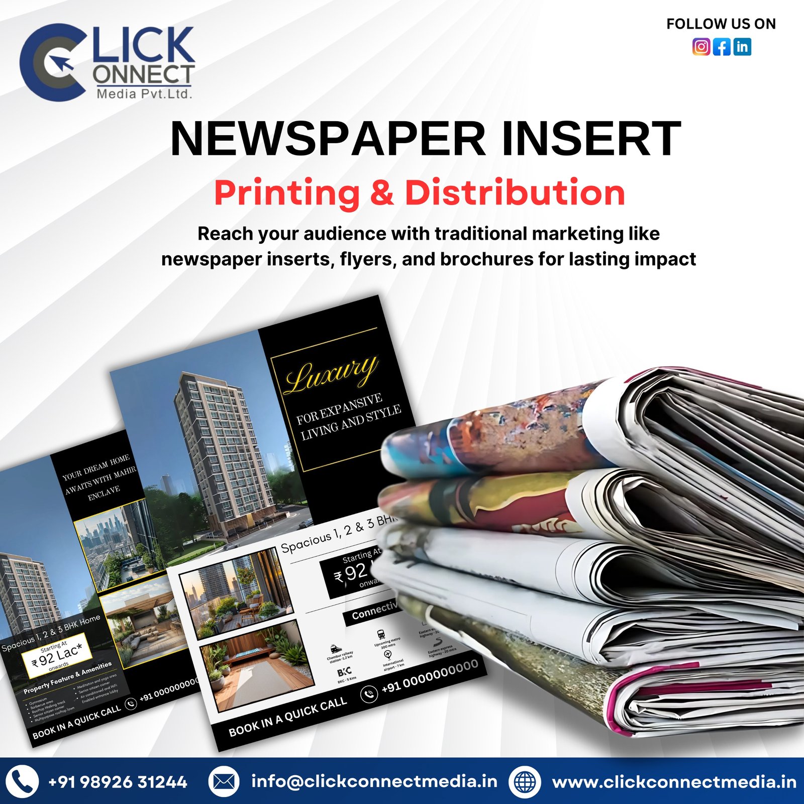 Click Connect Media Pvt Ltd offers high-impact paper insert advertising to help businesses connect with their target audience through newspapers and magazines. Our strategically placed inserts, such as flyers, brochures, and coupons, ensure maximum reach, visibility, and engagement. Whether you're launching a new product, promoting a special offer, or building brand awareness, our cost-effective and result-driven approach guarantees a strong response. With customized designs and precise distribution, we help brands create a lasting impression and drive customer action effectively.